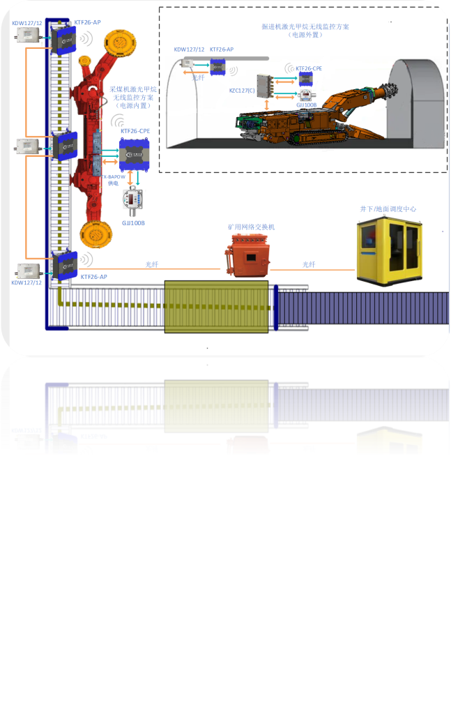 该系统由GJJ100B激光甲烷传感器、KTF26无线基站、TX-BAPOW输出本质安全型电源、KDW127/12直流稳压电源和井下环网交换机等部分组成。其中,激光甲烷传感器是系统的核心设备。TX-BAPOW安装在采煤机电控箱内部,负责输出12VDC电源以供电给GJJ100B和KTF26-CPE。系统主要实现以下功能: